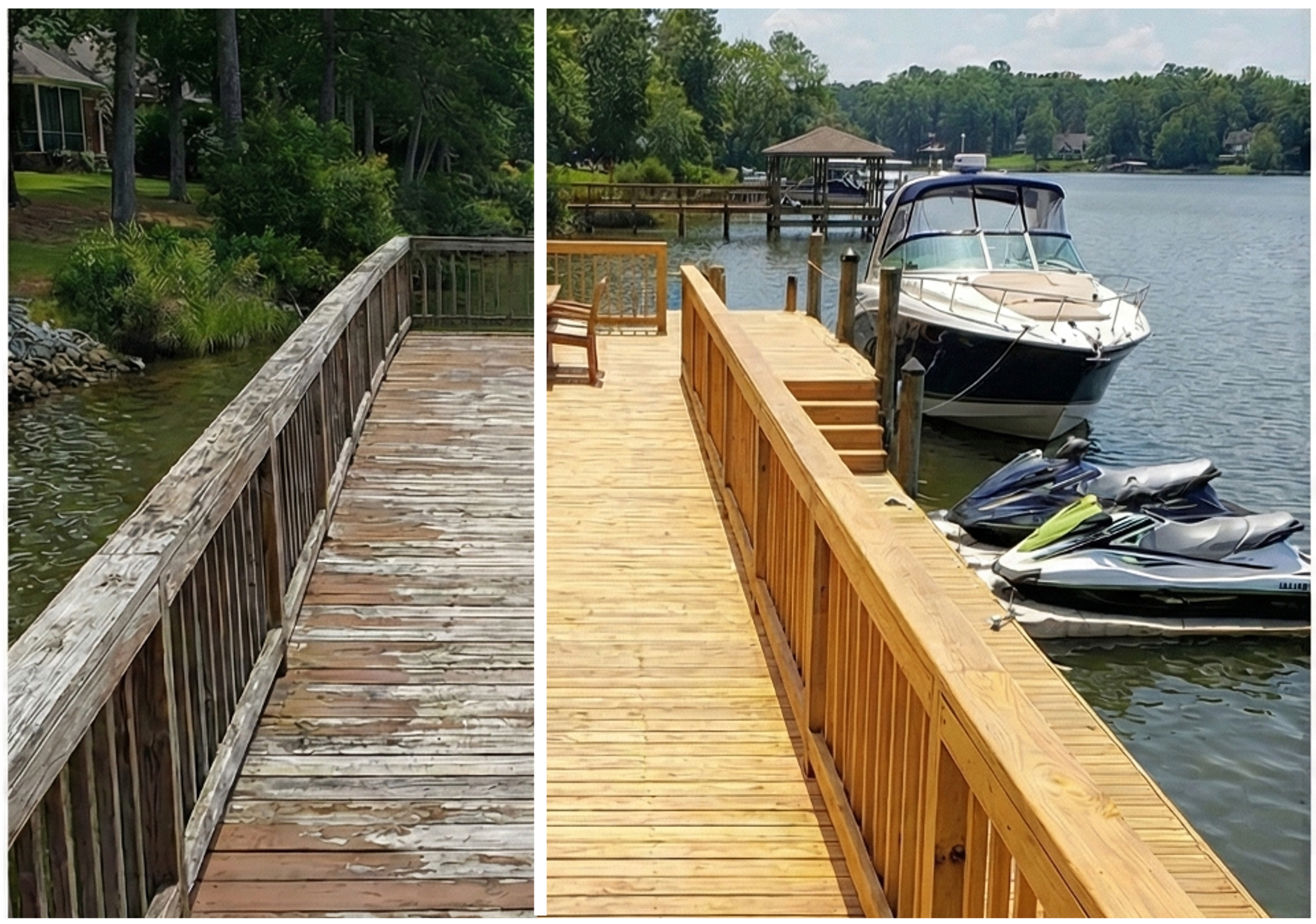 Permanent dock sealing replaces yearly staining. 25-year warranty. Serving Charlotte, Raleigh, Wilmington, Greenville, Charleston, Myrtle Beach, Jacksonville, Tampa, Orlando, Atlanta, Savannah, and communities across North Carolina, South Carolina, Florida, and Georgia.